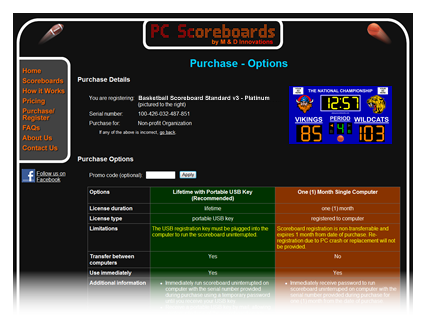 Purchasing a scoreboard is quick and easy using our automated licensing system. Receive your password for uninterrupted use immediately after purchase.