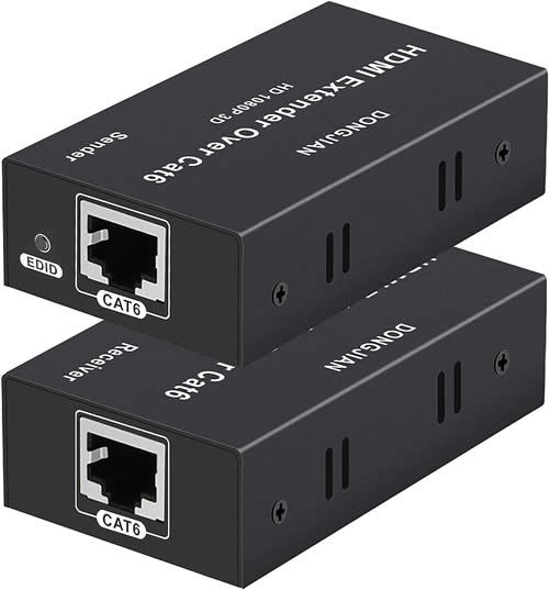 HDMI extenders can be used to connect your large spectator display to your scoreboard computer when typical long HDMI cables aren't long enough, such as when your distance is over 100 feet. They can typically extend the cable length to 300 feet or more. Many work by sending the HDMI signal over one or two ethernet cables, such as CAT5e or CAT6.
