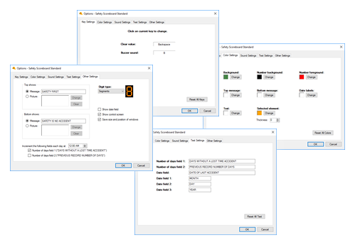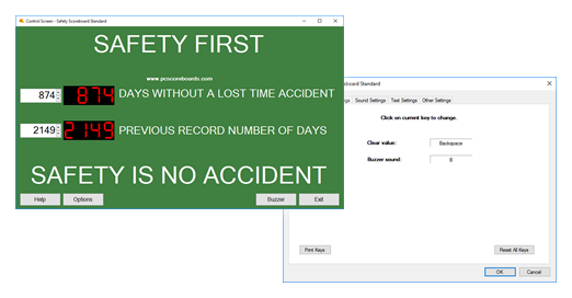 All PC Scoreboards safety scoreboards feature customizable messages, pictures, colors, sounds, keyboard shortcuts, and more. Display your company's name, logo, and colors.