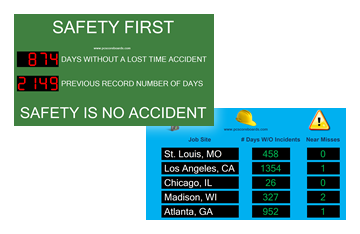 PC Scoreboards eliminates the compromises of prebuilt safety signs. Our 2 different safety scoreboard applications are designed to accommodate different safety tracking requirements.