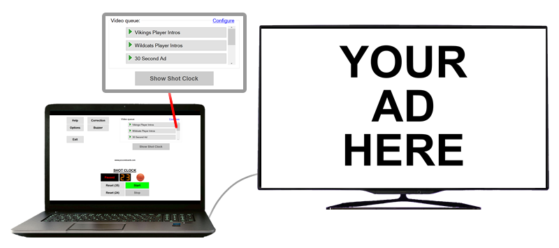 Display your own advertisements or other videos on your scoreboard. Use the advertising space to raise money for your school, team, or organization.