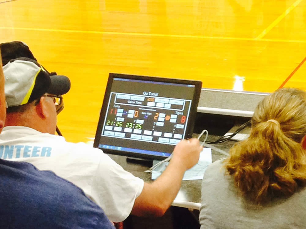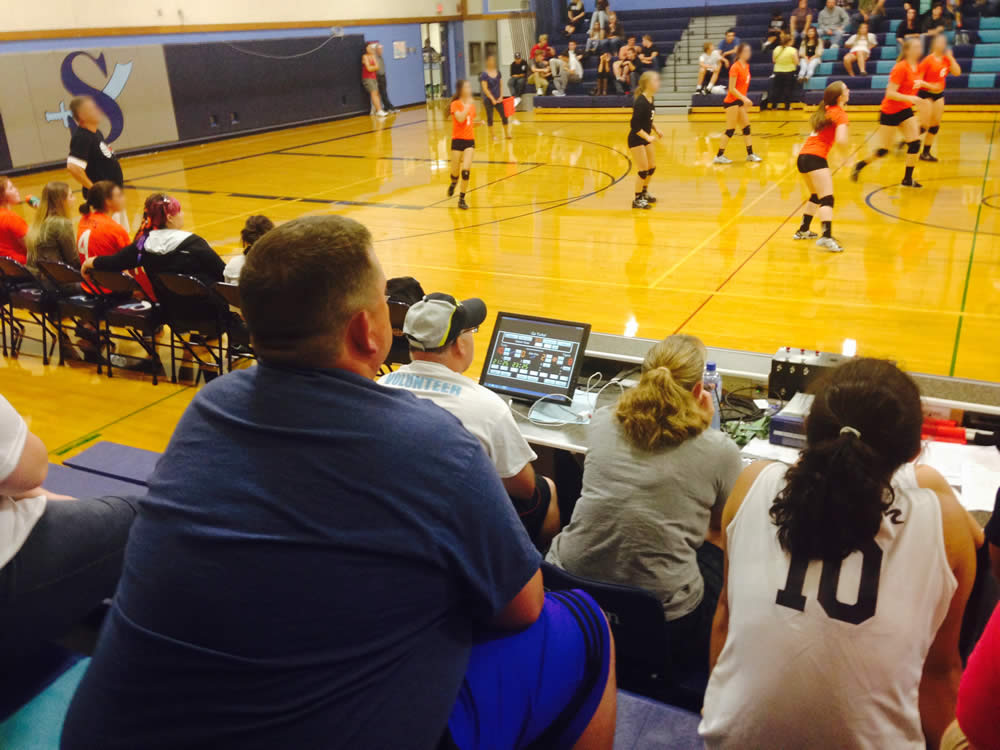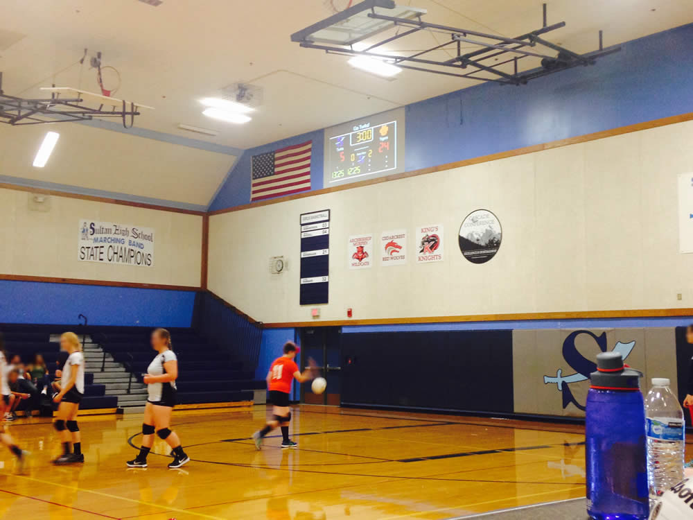 Sultan High School in Sultan, Washington, USA built an advanced scoreboard system for Volleyball, Basketball, and Wrestling. Their setup includes a scorer's table with displays in the front, projectors at each end of the court, shot clocks for basketball, and a score banner output for their live stream.