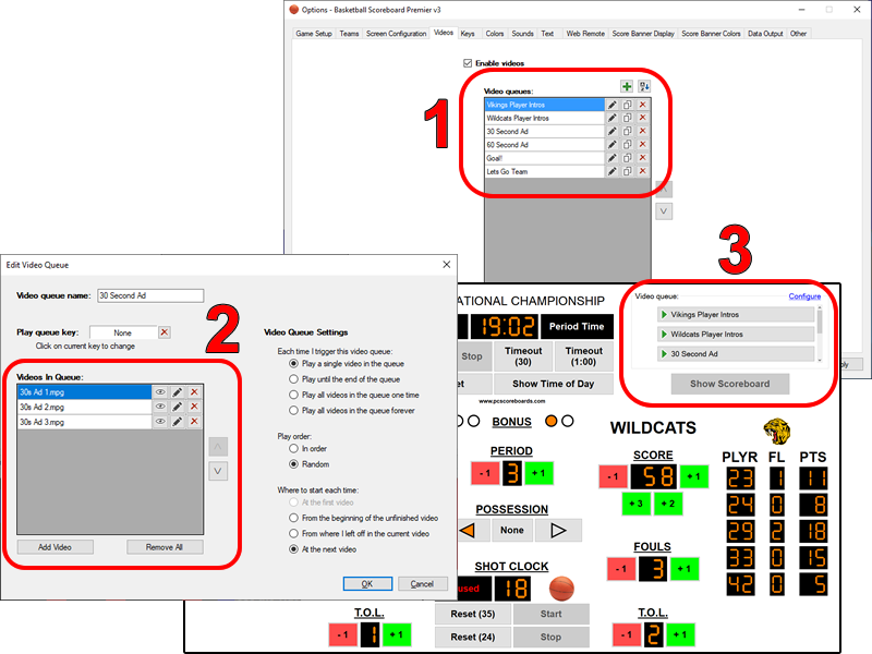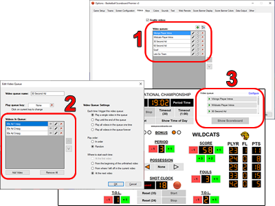 1. In the scoreboard options on the Videos tab, add a video queue.