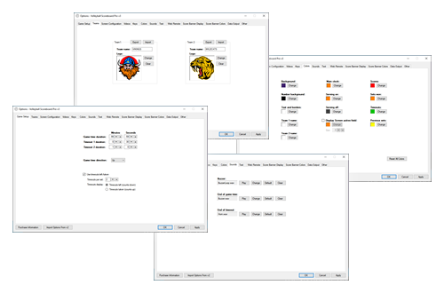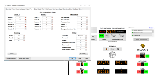 All PC Scoreboards volleyball scoreboards feature customizable team names, team logos, colors, sounds, keyboard shortcuts, and various rule settings. Display your teams' names and colors. Use your own period and timeout durations.